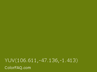 YUV 106.611,-47.136,-1.413 Color is a dark lime color and the nearest color is Olivetone #716e10. Hex code #697e0b and RGB value is rgb(105,126,11). In RGB color space, this color is composed of 41% red, 49% green, 4% blue, In CMYK color space, this color is composed of 17% cyan, 0% magenta, 91% yellow , 51% black , In HSL color space, this color has a hue angle of 71° , 84% saturation and 27% lightness.