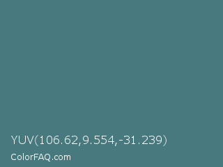 YUV 106.62,9.554,-31.239 Color is a normal cyan color and the nearest color is Faded Jade #427977. Hex code #47797e and RGB value is rgb(71,121,126). In RGB color space, this color is composed of 28% red, 47% green, 49% blue, In CMYK color space, this color is composed of 44% cyan, 4% magenta, 0% yellow , 51% black , In HSL color space, this color has a hue angle of 185° , 28% saturation and 39% lightness.