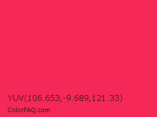 YUV 106.653,-9.689,121.33 Color is a normal red color and the nearest color is Awesome #ff2052. Hex code #f52857 and RGB value is rgb(245,40,87). In RGB color space, this color is composed of 96% red, 16% green, 34% blue, In CMYK color space, this color is composed of 0% cyan, 84% magenta, 64% yellow , 4% black , In HSL color space, this color has a hue angle of 346° , 91% saturation and 56% lightness.