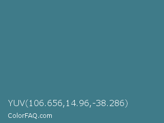 YUV 106.656,14.96,-38.286 Color is a normal cyan color and the nearest color is Teal Blue #367588. Hex code #3f7b89 and RGB value is rgb(63,123,137). In RGB color space, this color is composed of 25% red, 48% green, 54% blue, In CMYK color space, this color is composed of 54% cyan, 10% magenta, 0% yellow , 46% black , In HSL color space, this color has a hue angle of 191° , 37% saturation and 39% lightness.