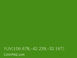 YUV 106.678,-42.239,-32.167 Color is a normal green color and the nearest color is Vida Loca #549019. Hex code #468e15 and RGB value is rgb(70,142,21). In RGB color space, this color is composed of 27% red, 56% green, 8% blue, In CMYK color space, this color is composed of 51% cyan, 0% magenta, 85% yellow , 44% black , In HSL color space, this color has a hue angle of 96° , 74% saturation and 32% lightness.