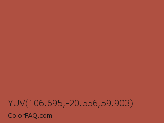 YUV 106.695,-20.556,59.903 Color is a normal red color and the nearest color is Apple Blossom #af4d43. Hex code #af5041 and RGB value is rgb(175,80,65). In RGB color space, this color is composed of 69% red, 31% green, 25% blue, In CMYK color space, this color is composed of 0% cyan, 54% magenta, 63% yellow , 31% black , In HSL color space, this color has a hue angle of 8° , 46% saturation and 47% lightness.
