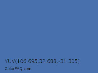 YUV 106.695,32.688,-31.305 Color is a normal blue color and the nearest color is San Marino #456cac. Hex code #4770ad and RGB value is rgb(71,112,173). In RGB color space, this color is composed of 28% red, 44% green, 68% blue, In CMYK color space, this color is composed of 59% cyan, 35% magenta, 0% yellow , 32% black , In HSL color space, this color has a hue angle of 216° , 42% saturation and 48% lightness.