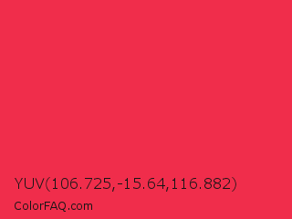 YUV 106.725,-15.64,116.882 Color is a normal red color and the nearest color is Amaranth #e52b50. Hex code #f02d4b and RGB value is rgb(240,45,75). In RGB color space, this color is composed of 94% red, 18% green, 29% blue, In CMYK color space, this color is composed of 0% cyan, 81% magenta, 69% yellow , 6% black , In HSL color space, this color has a hue angle of 351° , 87% saturation and 56% lightness.