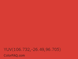 YUV 106.732,-26.49,96.705 Color is a normal red color and the nearest color is Punch #dc4333. Hex code #d93d35 and RGB value is rgb(217,61,53). In RGB color space, this color is composed of 85% red, 24% green, 21% blue, In CMYK color space, this color is composed of 0% cyan, 72% magenta, 76% yellow , 15% black , In HSL color space, this color has a hue angle of 3° , 68% saturation and 53% lightness.