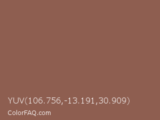 YUV 106.756,-13.191,30.909 Color is a normal red color and the nearest color is Spicy Mix #8b5f4d. Hex code #8e5e50 and RGB value is rgb(142,94,80). In RGB color space, this color is composed of 56% red, 37% green, 31% blue, In CMYK color space, this color is composed of 0% cyan, 34% magenta, 44% yellow , 44% black , In HSL color space, this color has a hue angle of 14° , 28% saturation and 44% lightness.