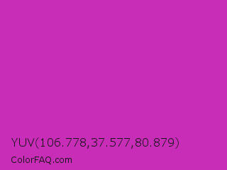 YUV 106.778,37.577,80.879 Color is a normal magenta color and the nearest color is Byzantine #bd33a4. Hex code #c72db7 and RGB value is rgb(199,45,183). In RGB color space, this color is composed of 78% red, 18% green, 72% blue, In CMYK color space, this color is composed of 0% cyan, 77% magenta, 8% yellow , 22% black , In HSL color space, this color has a hue angle of 306° , 63% saturation and 48% lightness.
