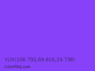 YUV 106.792,69.616,24.738 Color is a light violet color and the nearest color is Navy Purple #9457eb. Hex code #8741f8 and RGB value is rgb(135,65,248). In RGB color space, this color is composed of 53% red, 25% green, 97% blue, In CMYK color space, this color is composed of 46% cyan, 74% magenta, 0% yellow , 3% black , In HSL color space, this color has a hue angle of 263° , 93% saturation and 61% lightness.