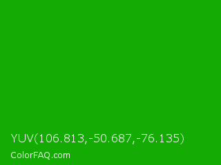 YUV 106.813,-50.687,-76.135 Color is a normal green color and the nearest color is Islamic Green #009000. Hex code #14ab04 and RGB value is rgb(20,171,4). In RGB color space, this color is composed of 8% red, 67% green, 2% blue, In CMYK color space, this color is composed of 88% cyan, 0% magenta, 98% yellow , 33% black , In HSL color space, this color has a hue angle of 114° , 95% saturation and 34% lightness.