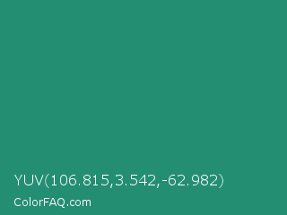 YUV 106.815,3.542,-62.982 Color is a normal cyan color and the nearest color is Illuminating Emerald #319177. Hex code #238e72 and RGB value is rgb(35,142,114). In RGB color space, this color is composed of 14% red, 56% green, 45% blue, In CMYK color space, this color is composed of 75% cyan, 0% magenta, 20% yellow , 44% black , In HSL color space, this color has a hue angle of 164° , 60% saturation and 35% lightness.