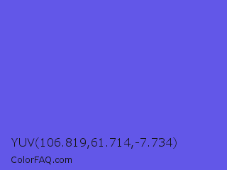 YUV 106.819,61.714,-7.734 Color is a light indigo color and the nearest color is Majorelle Blue #6050dc. Hex code #6257e8 and RGB value is rgb(98,87,232). In RGB color space, this color is composed of 38% red, 34% green, 91% blue, In CMYK color space, this color is composed of 58% cyan, 63% magenta, 0% yellow , 9% black , In HSL color space, this color has a hue angle of 245° , 76% saturation and 63% lightness.
