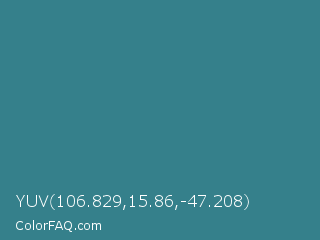 YUV 106.829,15.86,-47.208 Color is a normal cyan color and the nearest color is Paradiso #317d82. Hex code #35808b and RGB value is rgb(53,128,139). In RGB color space, this color is composed of 21% red, 50% green, 55% blue, In CMYK color space, this color is composed of 62% cyan, 8% magenta, 0% yellow , 45% black , In HSL color space, this color has a hue angle of 188° , 45% saturation and 38% lightness.