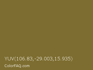 YUV 106.83,-29.003,15.935 Color is a normal yellow color and the nearest color is Spanish Bistre #807532. Hex code #7d6d30 and RGB value is rgb(125,109,48). In RGB color space, this color is composed of 49% red, 43% green, 19% blue, In CMYK color space, this color is composed of 0% cyan, 13% magenta, 62% yellow , 51% black , In HSL color space, this color has a hue angle of 48° , 45% saturation and 34% lightness.