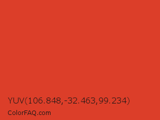 YUV 106.848,-32.463,99.234 Color is a normal red color and the nearest color is CG Red #e03c31. Hex code #dc3e29 and RGB value is rgb(220,62,41). In RGB color space, this color is composed of 86% red, 24% green, 16% blue, In CMYK color space, this color is composed of 0% cyan, 72% magenta, 81% yellow , 14% black , In HSL color space, this color has a hue angle of 7° , 72% saturation and 51% lightness.
