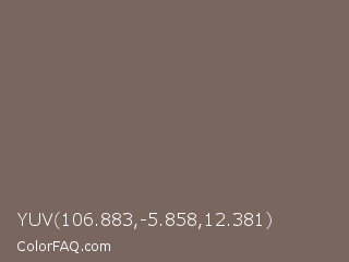 YUV 106.883,-5.858,12.381 Color is a normal orange color and the nearest color is Sandstone #796d62. Hex code #79665f and RGB value is rgb(121,102,95). In RGB color space, this color is composed of 47% red, 40% green, 37% blue, In CMYK color space, this color is composed of 0% cyan, 16% magenta, 21% yellow , 53% black , In HSL color space, this color has a hue angle of 16° , 12% saturation and 42% lightness.