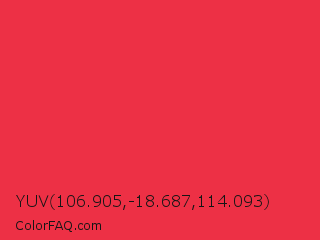 YUV 106.905,-18.687,114.093 Color is a normal red color and the nearest color is Deep Carmine Pink #ef3038. Hex code #ed3045 and RGB value is rgb(237,48,69). In RGB color space, this color is composed of 93% red, 19% green, 27% blue, In CMYK color space, this color is composed of 0% cyan, 80% magenta, 71% yellow , 7% black , In HSL color space, this color has a hue angle of 353° , 84% saturation and 56% lightness.