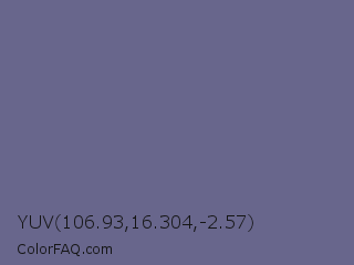 YUV 106.93,16.304,-2.57 Color is a normal indigo color and the nearest color is Dark Blue Gray #666699. Hex code #68668c and RGB value is rgb(104,102,140). In RGB color space, this color is composed of 41% red, 40% green, 55% blue, In CMYK color space, this color is composed of 26% cyan, 27% magenta, 0% yellow , 45% black , In HSL color space, this color has a hue angle of 243° , 16% saturation and 47% lightness.