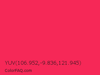 YUV 106.952,-9.836,121.945 Color is a normal red color and the nearest color is Awesome #ff2052. Hex code #f62857 and RGB value is rgb(246,40,87). In RGB color space, this color is composed of 96% red, 16% green, 34% blue, In CMYK color space, this color is composed of 0% cyan, 84% magenta, 65% yellow , 4% black , In HSL color space, this color has a hue angle of 346° , 92% saturation and 56% lightness.