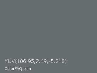 YUV 106.95,2.49,-5.218 Color is a normal blue color and the nearest color is Nevada #646e75. Hex code #656d70 and RGB value is rgb(101,109,112). In RGB color space, this color is composed of 40% red, 43% green, 44% blue, In CMYK color space, this color is composed of 10% cyan, 3% magenta, 0% yellow , 56% black , In HSL color space, this color has a hue angle of 196° , 5% saturation and 42% lightness.