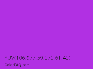 YUV 106.977,59.171,61.41 Color is a normal purple color and the nearest color is Veronica #a020f0. Hex code #b130e3 and RGB value is rgb(177,48,227). In RGB color space, this color is composed of 69% red, 19% green, 89% blue, In CMYK color space, this color is composed of 22% cyan, 79% magenta, 0% yellow , 11% black , In HSL color space, this color has a hue angle of 283° , 76% saturation and 54% lightness.