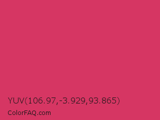 YUV 106.97,-3.929,93.865 Color is a normal rose color and the nearest color is Cerise Red #de3163. Hex code #d63663 and RGB value is rgb(214,54,99). In RGB color space, this color is composed of 84% red, 21% green, 39% blue, In CMYK color space, this color is composed of 0% cyan, 75% magenta, 54% yellow , 16% black , In HSL color space, this color has a hue angle of 343° , 66% saturation and 53% lightness.