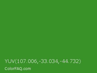 YUV 107.006,-33.034,-44.732 Color is a normal green color and the nearest color is La Palma #368716. Hex code #389228 and RGB value is rgb(56,146,40). In RGB color space, this color is composed of 22% red, 57% green, 16% blue, In CMYK color space, this color is composed of 62% cyan, 0% magenta, 73% yellow , 43% black , In HSL color space, this color has a hue angle of 111° , 57% saturation and 36% lightness.