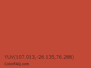 YUV 107.013,-26.135,76.288 Color is a normal red color and the nearest color is Mojo #c04737. Hex code #c24936 and RGB value is rgb(194,73,54). In RGB color space, this color is composed of 76% red, 29% green, 21% blue, In CMYK color space, this color is composed of 0% cyan, 62% magenta, 72% yellow , 24% black , In HSL color space, this color has a hue angle of 8° , 56% saturation and 49% lightness.