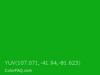 YUV 107.071,-41.94,-81.623 Color is a normal green color and the nearest color is Slimy Green #299617. Hex code #0eab16 and RGB value is rgb(14,171,22). In RGB color space, this color is composed of 5% red, 67% green, 9% blue, In CMYK color space, this color is composed of 92% cyan, 0% magenta, 87% yellow , 33% black , In HSL color space, this color has a hue angle of 123° , 85% saturation and 36% lightness.