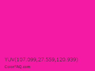 YUV 107.099,27.559,120.939 Color is a normal magenta color and the nearest color is Persian Rose #fe28a2. Hex code #f51aa3 and RGB value is rgb(245,26,163). In RGB color space, this color is composed of 96% red, 10% green, 64% blue, In CMYK color space, this color is composed of 0% cyan, 89% magenta, 33% yellow , 4% black , In HSL color space, this color has a hue angle of 322° , 92% saturation and 53% lightness.