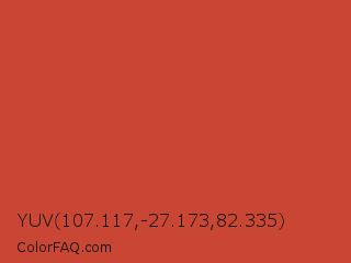 YUV 107.117,-27.173,82.335 Color is a normal red color and the nearest color is Mojo #c04737. Hex code #c94634 and RGB value is rgb(201,70,52). In RGB color space, this color is composed of 79% red, 27% green, 20% blue, In CMYK color space, this color is composed of 0% cyan, 65% magenta, 74% yellow , 21% black , In HSL color space, this color has a hue angle of 7° , 59% saturation and 50% lightness.