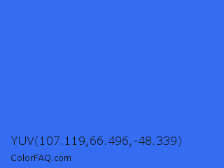 YUV 107.119,66.496,-48.339 Color is a normal blue color and the nearest color is Ultramarine Blue #4166f5. Hex code #346df2 and RGB value is rgb(52,109,242). In RGB color space, this color is composed of 20% red, 43% green, 95% blue, In CMYK color space, this color is composed of 79% cyan, 55% magenta, 0% yellow , 5% black , In HSL color space, this color has a hue angle of 222° , 88% saturation and 58% lightness.