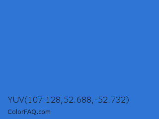 YUV 107.128,52.688,-52.732 Color is a normal blue color and the nearest color is Mariner #286acd. Hex code #2f75d6 and RGB value is rgb(47,117,214). In RGB color space, this color is composed of 18% red, 46% green, 84% blue, In CMYK color space, this color is composed of 78% cyan, 45% magenta, 0% yellow , 16% black , In HSL color space, this color has a hue angle of 215° , 67% saturation and 51% lightness.