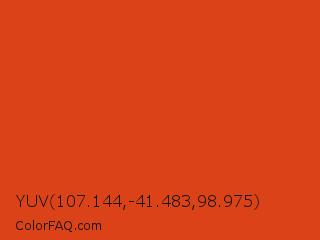 YUV 107.144,-41.483,98.975 Color is a normal red color and the nearest color is Vermilion #d9381e. Hex code #dc4217 and RGB value is rgb(220,66,23). In RGB color space, this color is composed of 86% red, 26% green, 9% blue, In CMYK color space, this color is composed of 0% cyan, 70% magenta, 90% yellow , 14% black , In HSL color space, this color has a hue angle of 13° , 81% saturation and 48% lightness.