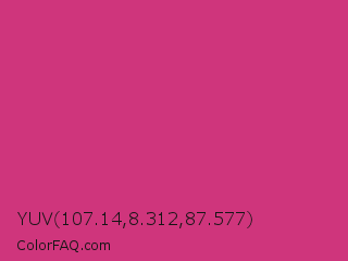 YUV 107.14,8.312,87.577 Color is a normal rose color and the nearest color is Fuchsia Purple #cc397b. Hex code #cf357c and RGB value is rgb(207,53,124). In RGB color space, this color is composed of 81% red, 21% green, 49% blue, In CMYK color space, this color is composed of 0% cyan, 74% magenta, 40% yellow , 19% black , In HSL color space, this color has a hue angle of 332° , 62% saturation and 51% lightness.