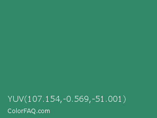 YUV 107.154,-0.569,-51.001 Color is a normal green color and the nearest color is Illuminating Emerald #319177. Hex code #31896a and RGB value is rgb(49,137,106). In RGB color space, this color is composed of 19% red, 54% green, 42% blue, In CMYK color space, this color is composed of 64% cyan, 0% magenta, 23% yellow , 46% black , In HSL color space, this color has a hue angle of 159° , 47% saturation and 36% lightness.