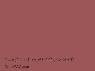 YUV 107.158,-9.445,42.834 Color is a normal red color and the nearest color is Middle Red Purple #a55353. Hex code #9c5658 and RGB value is rgb(156,86,88). In RGB color space, this color is composed of 61% red, 34% green, 35% blue, In CMYK color space, this color is composed of 0% cyan, 45% magenta, 44% yellow , 39% black , In HSL color space, this color has a hue angle of 358° , 29% saturation and 47% lightness.