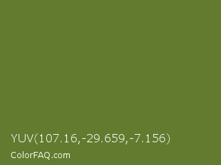 YUV 107.16,-29.659,-7.156 Color is a normal lime color and the nearest color is Crete #737829. Hex code #637b2f and RGB value is rgb(99,123,47). In RGB color space, this color is composed of 39% red, 48% green, 18% blue, In CMYK color space, this color is composed of 20% cyan, 0% magenta, 62% yellow , 52% black , In HSL color space, this color has a hue angle of 79° , 45% saturation and 33% lightness.