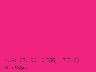 YUV 107.196,10.256,117.346 Color is a normal rose color and the nearest color is Barbie Pink #e0218a. Hex code #f12380 and RGB value is rgb(241,35,128). In RGB color space, this color is composed of 95% red, 14% green, 50% blue, In CMYK color space, this color is composed of 0% cyan, 85% magenta, 47% yellow , 5% black , In HSL color space, this color has a hue angle of 333° , 88% saturation and 54% lightness.
