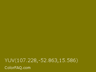 YUV 107.228,-52.863,15.586 Color is a dark yellow color and the nearest color is Olive #808000. Hex code #7d7700 and RGB value is rgb(125,119,-0). In RGB color space, this color is composed of 49% red, 47% green, 0% blue, In CMYK color space, this color is composed of 0% cyan, 5% magenta, 100% yellow , 51% black , In HSL color space, this color has a hue angle of 57° , 100% saturation and 25% lightness.