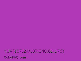 YUV 107.244,37.348,61.176 Color is a normal magenta color and the nearest color is Byzantine #bd33a4. Hex code #b139b7 and RGB value is rgb(177,57,183). In RGB color space, this color is composed of 69% red, 22% green, 72% blue, In CMYK color space, this color is composed of 3% cyan, 69% magenta, 0% yellow , 28% black , In HSL color space, this color has a hue angle of 297° , 53% saturation and 47% lightness.