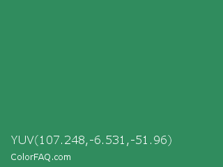 YUV 107.248,-6.531,-51.96 Color is a normal green color and the nearest color is Sea Green #2e8b57. Hex code #308c5e and RGB value is rgb(48,140,94). In RGB color space, this color is composed of 19% red, 55% green, 37% blue, In CMYK color space, this color is composed of 66% cyan, 0% magenta, 33% yellow , 45% black , In HSL color space, this color has a hue angle of 150° , 49% saturation and 37% lightness.