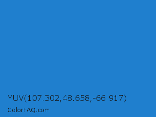 YUV 107.302,48.658,-66.917 Color is a normal blue color and the nearest color is Bright Navy Blue #1974d2. Hex code #1f7fce and RGB value is rgb(31,127,206). In RGB color space, this color is composed of 12% red, 50% green, 81% blue, In CMYK color space, this color is composed of 85% cyan, 38% magenta, 0% yellow , 19% black , In HSL color space, this color has a hue angle of 207° , 74% saturation and 46% lightness.