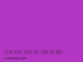 YUV 107.335,42.726,62.85 Color is a normal magenta color and the nearest color is Steel Pink #cc33cc. Hex code #b336c2 and RGB value is rgb(179,54,194). In RGB color space, this color is composed of 70% red, 21% green, 76% blue, In CMYK color space, this color is composed of 8% cyan, 72% magenta, 0% yellow , 24% black , In HSL color space, this color has a hue angle of 294° , 56% saturation and 49% lightness.