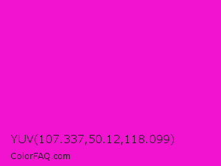 YUV 107.337,50.12,118.099 Color is a normal magenta color and the nearest color is Hot Magenta #ff1dce. Hex code #f213d1 and RGB value is rgb(242,19,209). In RGB color space, this color is composed of 95% red, 7% green, 82% blue, In CMYK color space, this color is composed of 0% cyan, 92% magenta, 14% yellow , 5% black , In HSL color space, this color has a hue angle of 309° , 90% saturation and 51% lightness.