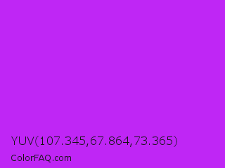 YUV 107.345,67.864,73.365 Color is a normal purple color and the nearest color is Veronica #a020f0. Hex code #bf26f5 and RGB value is rgb(191,38,245). In RGB color space, this color is composed of 75% red, 15% green, 96% blue, In CMYK color space, this color is composed of 22% cyan, 84% magenta, 0% yellow , 4% black , In HSL color space, this color has a hue angle of 284° , 91% saturation and 55% lightness.