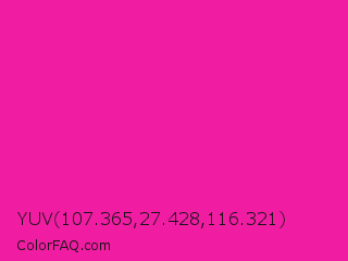 YUV 107.365,27.428,116.321 Color is a normal magenta color and the nearest color is Persian Rose #fe28a2. Hex code #f01da3 and RGB value is rgb(240,29,163). In RGB color space, this color is composed of 94% red, 11% green, 64% blue, In CMYK color space, this color is composed of 0% cyan, 88% magenta, 32% yellow , 6% black , In HSL color space, this color has a hue angle of 322° , 88% saturation and 53% lightness.
