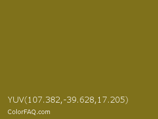 YUV 107.382,-39.628,17.205 Color is a dark yellow color and the nearest color is Olivetone #716e10. Hex code #7f711b and RGB value is rgb(127,113,27). In RGB color space, this color is composed of 50% red, 44% green, 11% blue, In CMYK color space, this color is composed of 0% cyan, 11% magenta, 79% yellow , 50% black , In HSL color space, this color has a hue angle of 52° , 65% saturation and 30% lightness.