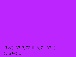 YUV 107.3,72.816,71.651 Color is a normal purple color and the nearest color is Veronica #a020f0. Hex code #bd25ff and RGB value is rgb(189,37,255). In RGB color space, this color is composed of 74% red, 15% green, 100% blue, In CMYK color space, this color is composed of 26% cyan, 85% magenta, 0% yellow , 0% black , In HSL color space, this color has a hue angle of 282° , 100% saturation and 57% lightness.