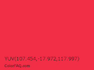 YUV 107.454,-17.972,117.997 Color is a normal red color and the nearest color is Deep Carmine Pink #ef3038. Hex code #f22e47 and RGB value is rgb(242,46,71). In RGB color space, this color is composed of 95% red, 18% green, 28% blue, In CMYK color space, this color is composed of 0% cyan, 81% magenta, 71% yellow , 5% black , In HSL color space, this color has a hue angle of 352° , 88% saturation and 56% lightness.