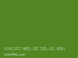 YUV 107.465,-35.725,-21.456 Color is a normal green color and the nearest color is Sap Green #507d2a. Hex code #538623 and RGB value is rgb(83,134,35). In RGB color space, this color is composed of 33% red, 53% green, 14% blue, In CMYK color space, this color is composed of 38% cyan, 0% magenta, 74% yellow , 47% black , In HSL color space, this color has a hue angle of 91° , 59% saturation and 33% lightness.